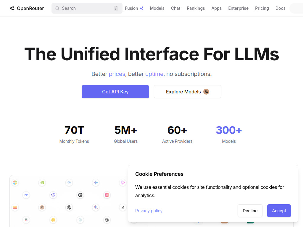 4.0 / 5(1 oy)60+ sağlayıcıdan 300+ LLM modeline tek API üzerinden erişim sağlayan birleştirilmiş arayüz.